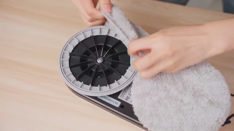 Fixez les nouvelles lingettes bien à plat sur les patins du robot. Vérifiez qu’elles sont bien centrées pour un nettoyage homogène.